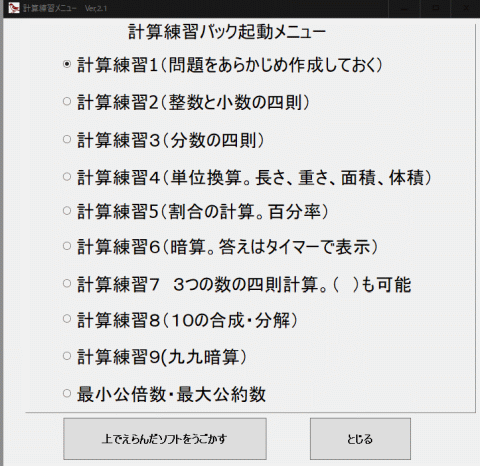 単品で公開している計算練習1~9と最小公倍数・最大公約数の練習・プリント作成パックです。
